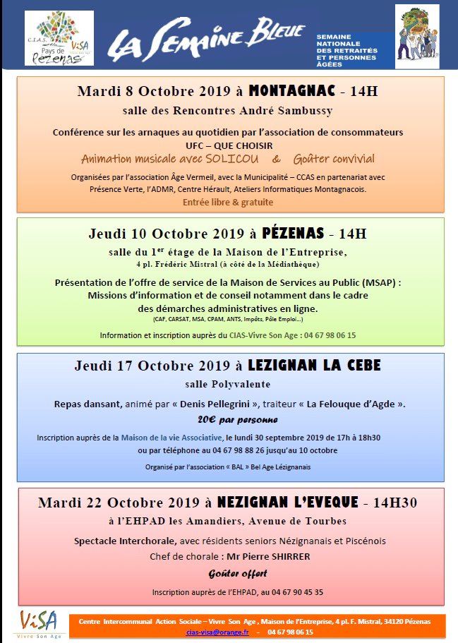 Du 8 au 22 octobre, à l’occasion de la semaine nationale des retraités et personnes âgées de nombreuses animations auront lieu dans les villages de Montagnac, Pézenas, Lézignan la Cèbe et Nézignan l’Évêque. Ouvert à tous