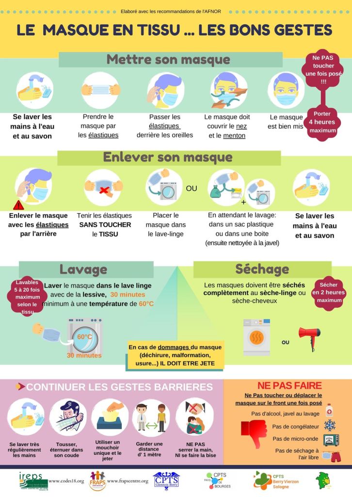 - Quelques bons conseils pratiques pour bien utiliser et entretenir vos masques en tissus :