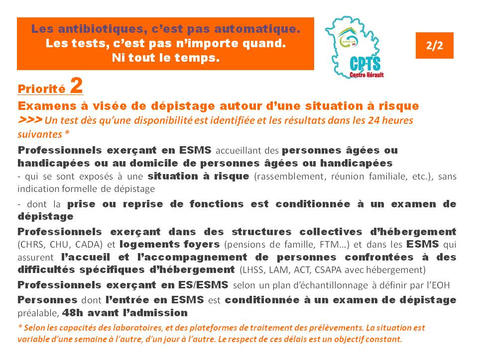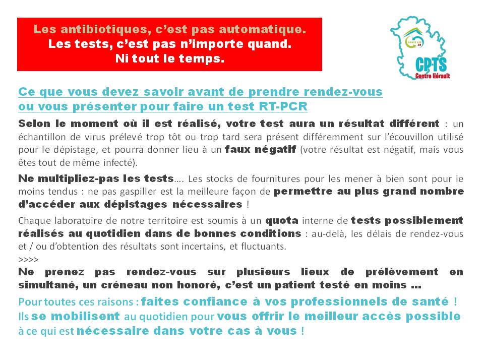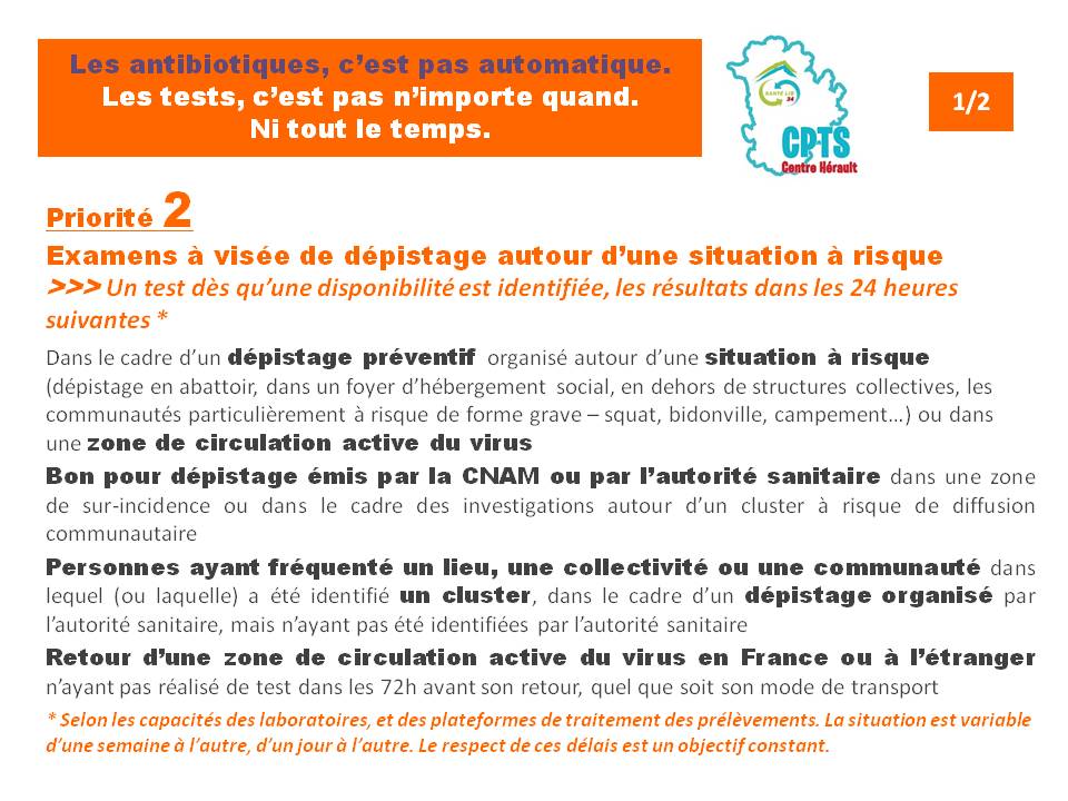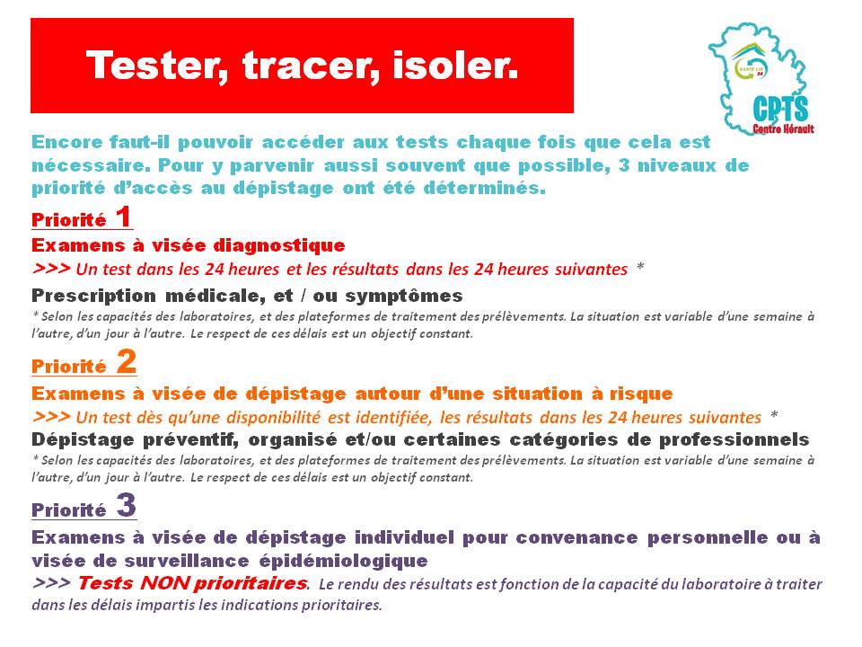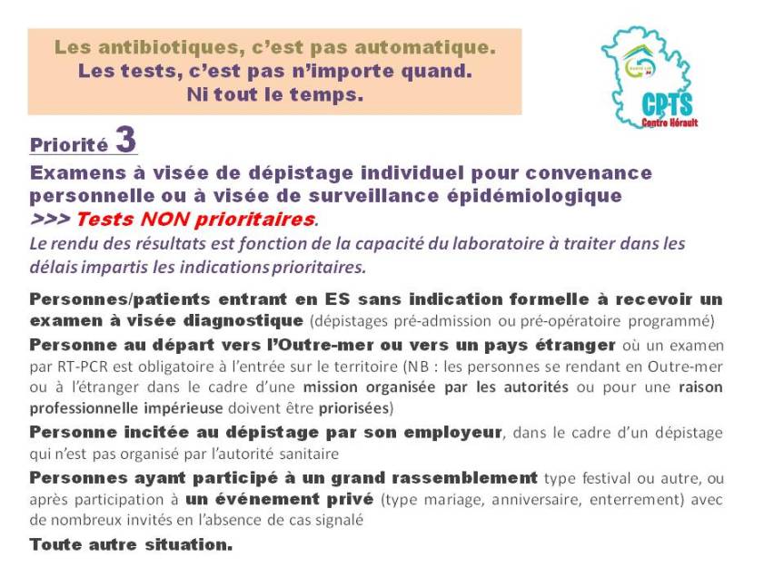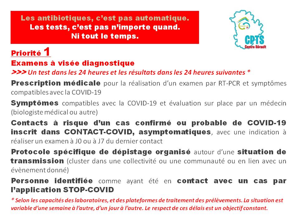 ATTENTION, compte tenu de la grande tension sur les tests, les prélèvements pour tests COVID à Pezenas ne sont possibles que sur prescription médicale, dans les cas de priorité 1 et sur RDV.
