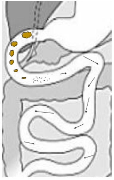 L’intestin est divisé en trois partie le duodénum, le jéjunum et l’iléon. Une fois que la vidange gastrique a eu lieu le chyme gastrique arrive d’abord au niveau du duodénum. A cet endroit il va être digéré grâce aux sécrétions digestives produites par le foie, la vésicule biliaire et le pancréas. Cette digestion permettra de transformer les aliments du chyme gastrique en nutriments qui arriveront ensuite au niveau du jéjunum et de l’iléon. Ils seront absorbés au travers de la paroi intestinale pour passer dans la circulation sanguine et que notre organisme les utilise pour vivre et se développer.