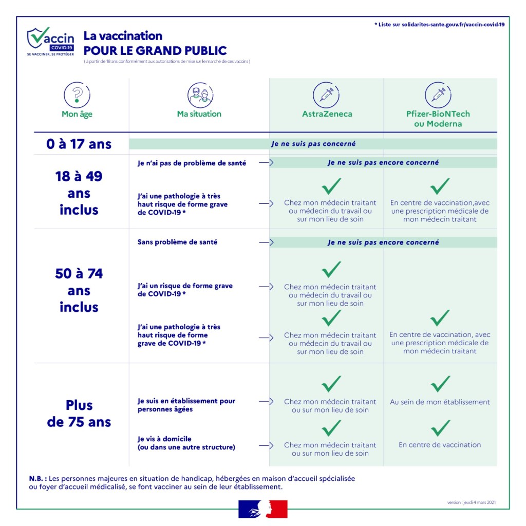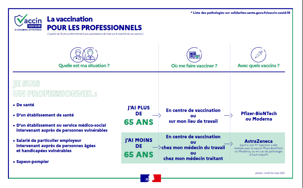 Les professionnels de santé, du médico-social, pompiers, aides à domicile sont aussi éligibles quelque soit l’âge à la vaccination par le vaccin Astra-Zeneca dans les centres de vaccinations dédiés (Béziers, Sète ou Montpellier) ou en se rapprochant de leur médecin traitant. Les personnes à très haut risque (selon liste donnée plus haut) restent éligibles au vaccin Pfizer.