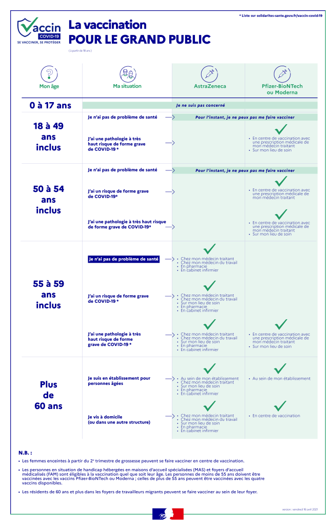 Pour les plus de 55 ans (sans critère de comorbidité), la vaccination est d’ores et déjà possible au cabinet de leur médecin traitant ou à la pharmacie. Vous pouvez vous rapprocher de lui pour connaitre les modalités.