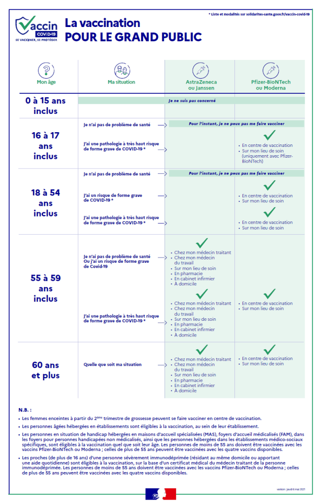 Pour les plus de 55 ans (sans critère de comorbidité), la vaccination est aussi possible au cabinet de leur médecin traitant ou à la pharmacie avec le vaccin Astra-Zeneca ou Janssen. Vous pouvez vous rapprocher de lui pour connaitre les modalités.