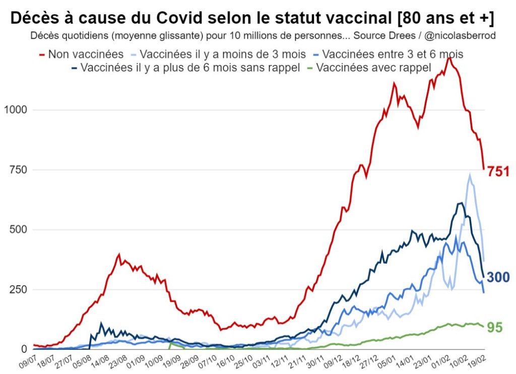 Actuellement, les données de la DREES montre que la vaccination avec un seul rappel protège encore bien les personnes de plus de 80 ans du risque de décès (courbe verte).
