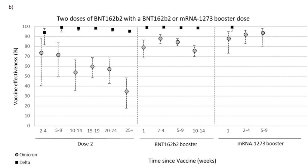 Pour les personnes âgées de plus de 80 ans, les données de l’UKHSA (agence de santé du Royaume Uni) montrent que les 3 doses de vaccin Pfizer ne sont plus efficaces qu’à hauteur de 75% contre l’hospitalisation avec Omicron, 10 à 14 semaines après le rappel.