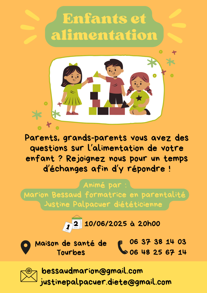Le mardi 10 Juin 2025 à 20h00 un atelier d’échanges destiné aux parents et grands-parents vous est proposé à la maison de santé, il portera sur les problématiques liées à l’alimentation chez l’enfant. Il sera animé par Marion Bessaud formatrice en parentalité, et Justine Palpacuer diététicienne-nutritionniste à la maison de santé.